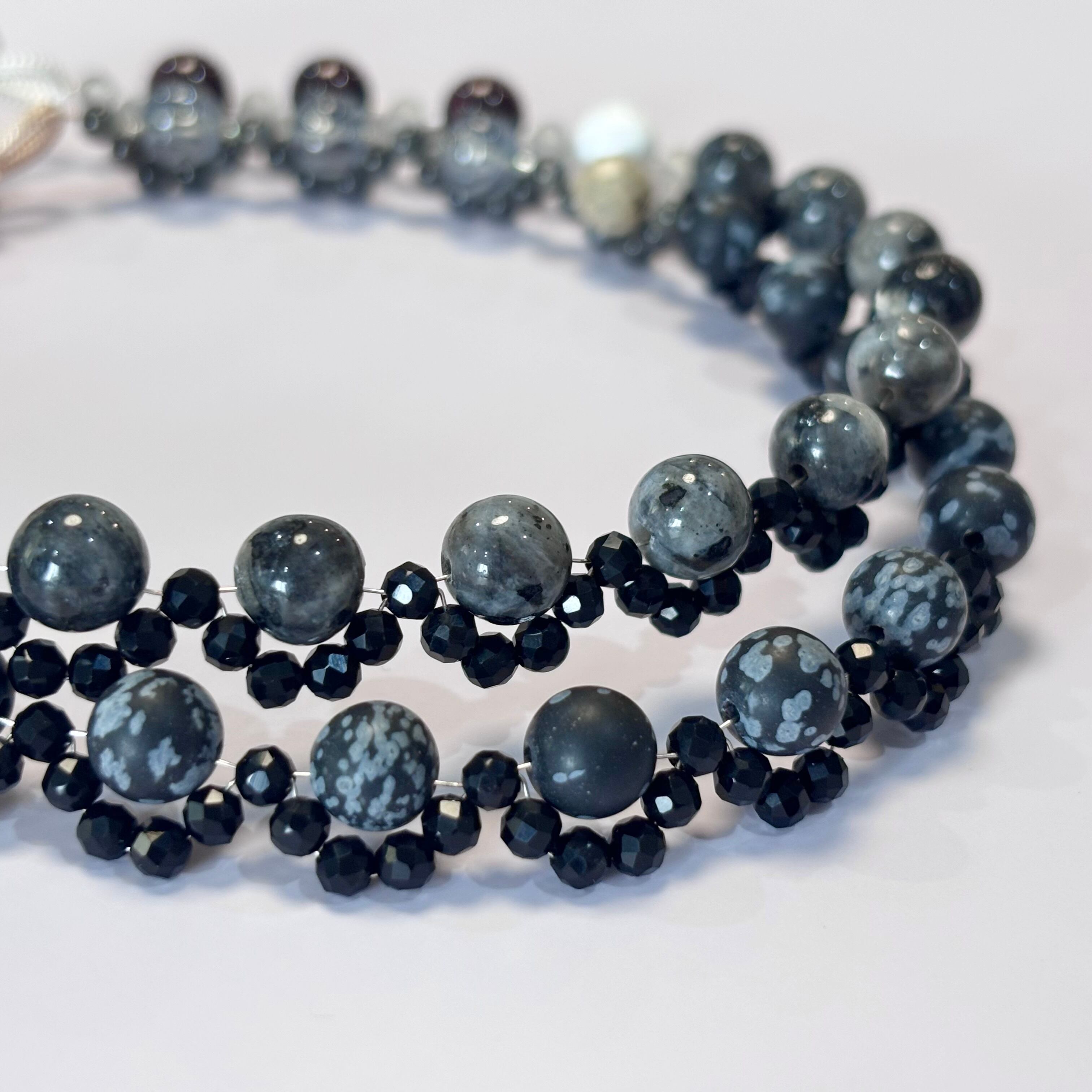 ビーズ:フラッシュクリスタル、スノーフレークオブシディアン、インプレッションストーン、キャッツアイ、オニキス