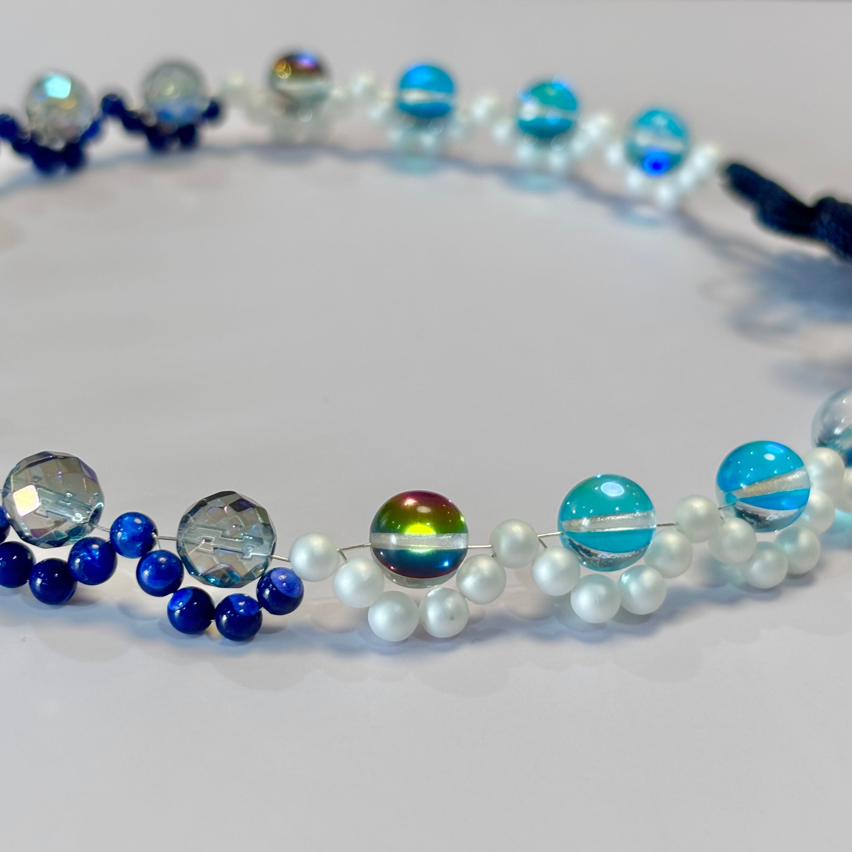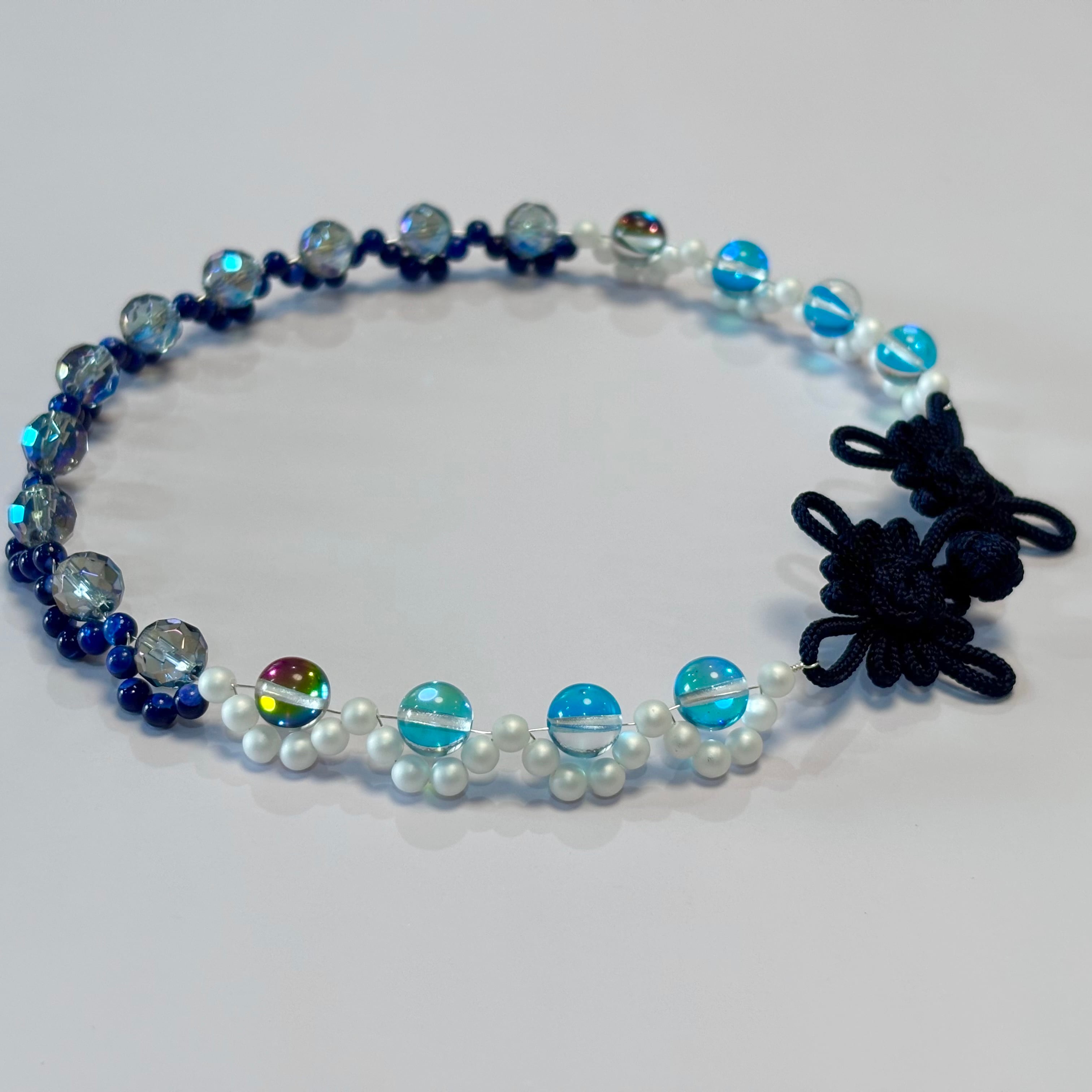 背面は透明感が美しいブルーのオーロラ調にきらめく水晶、ブルーフラッシュクリスタルにネイビーのマザーオブパールを合わせました。