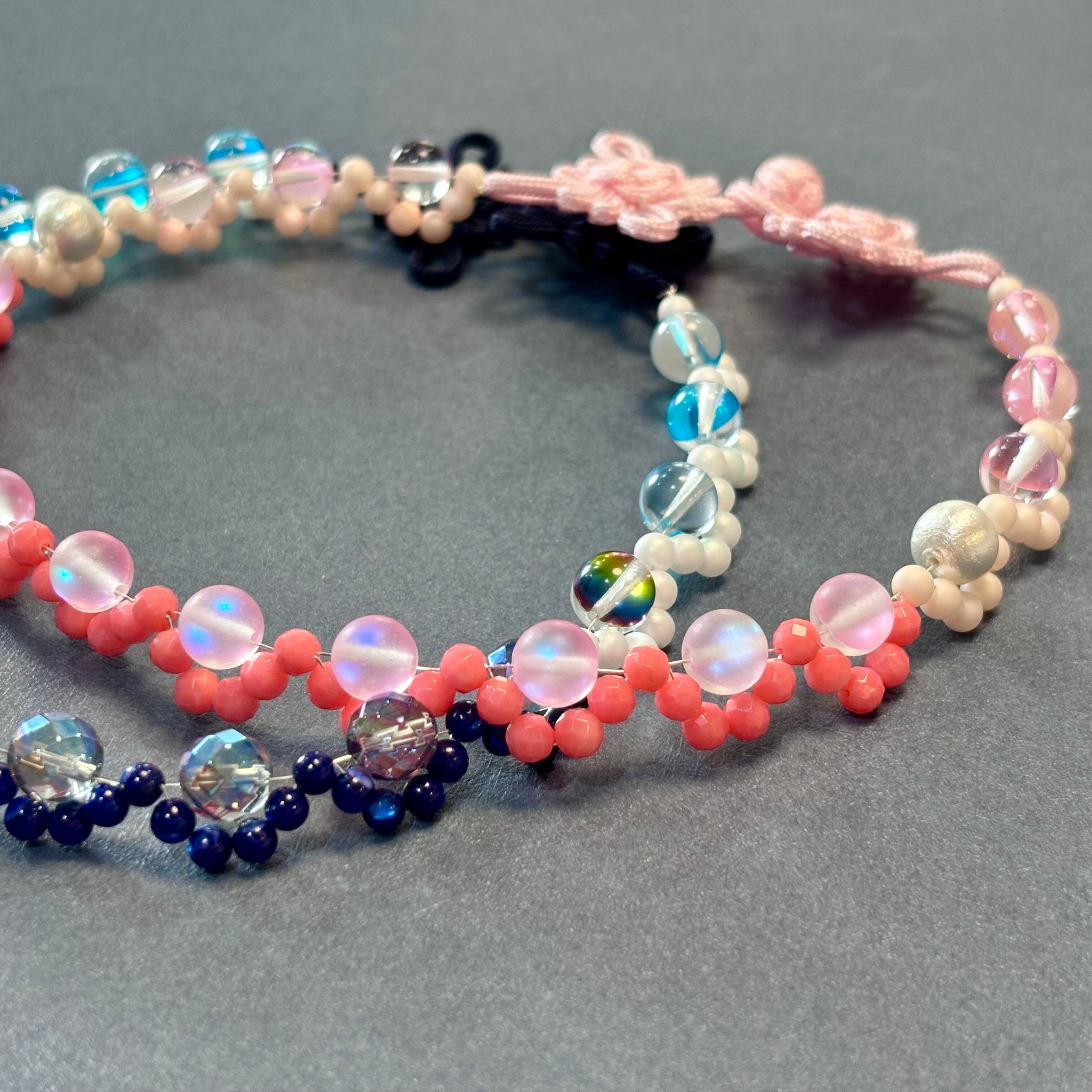ビーズ:ルナフラッシュ(人工石ガラス)、ユリヤ樹脂、フラッシュクリスタル(チタン蒸着)、マザーオブパール