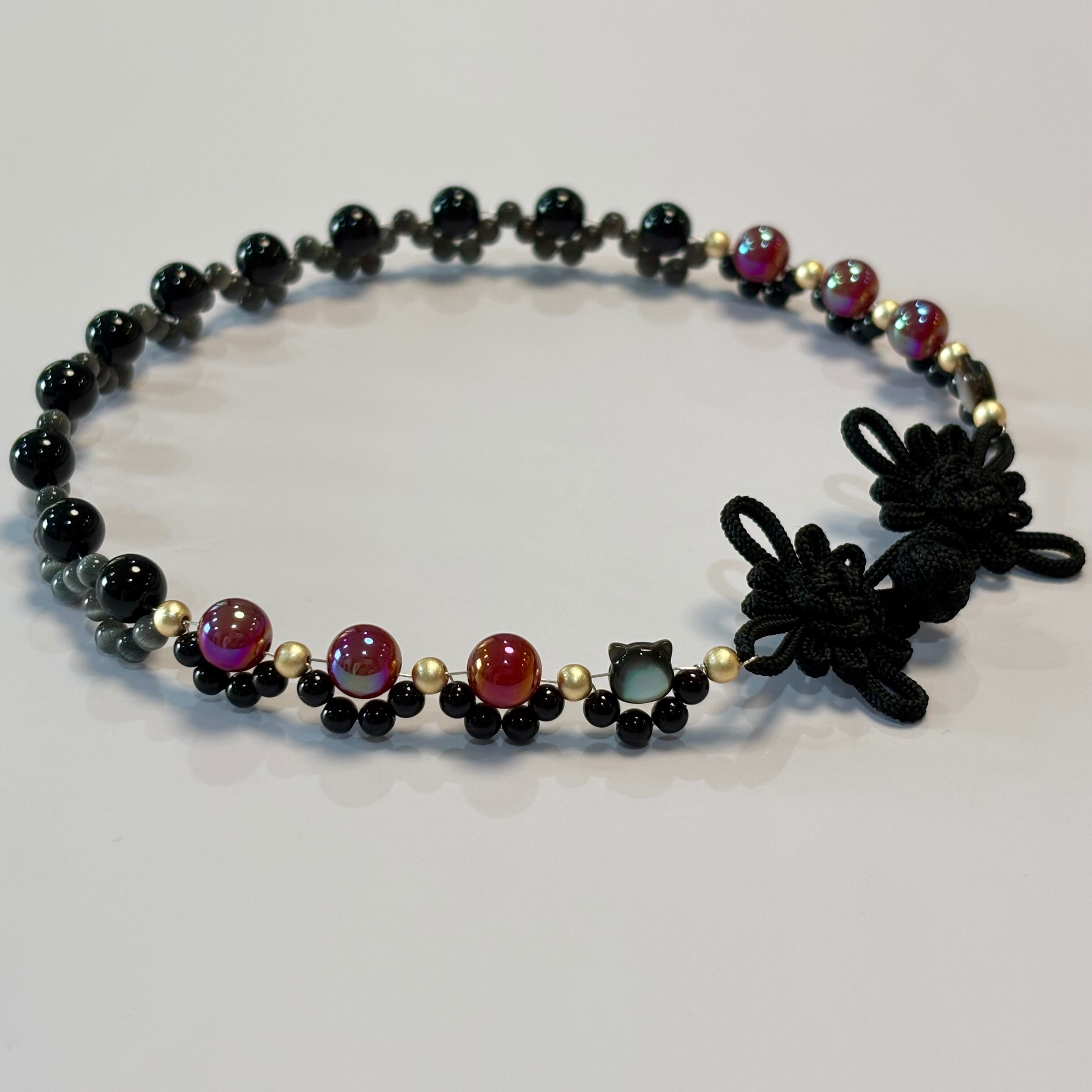 黒〜赤の締まったカラーでまとめつつ、ねこちゃんのビーズでこっそり可愛さも加えた一品。