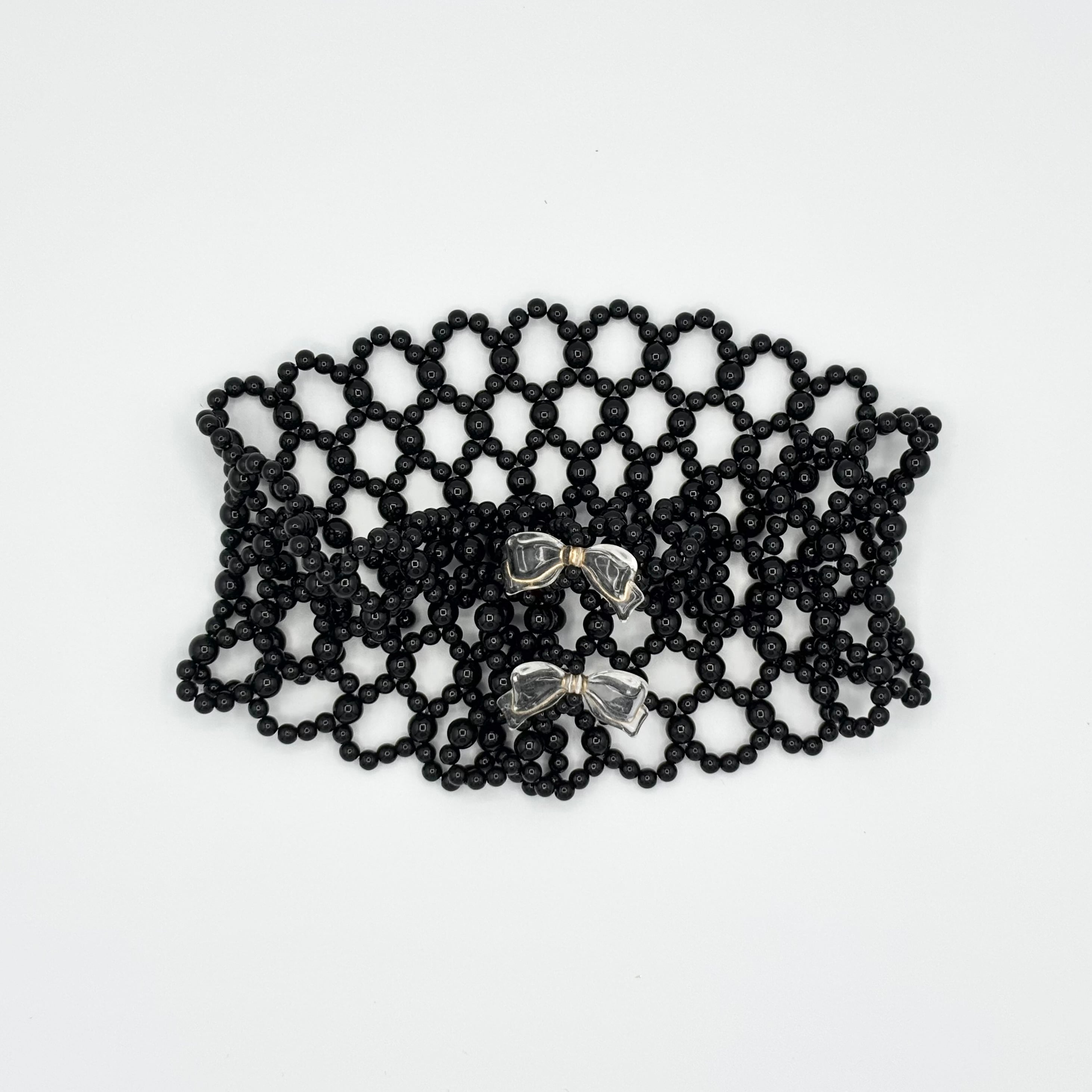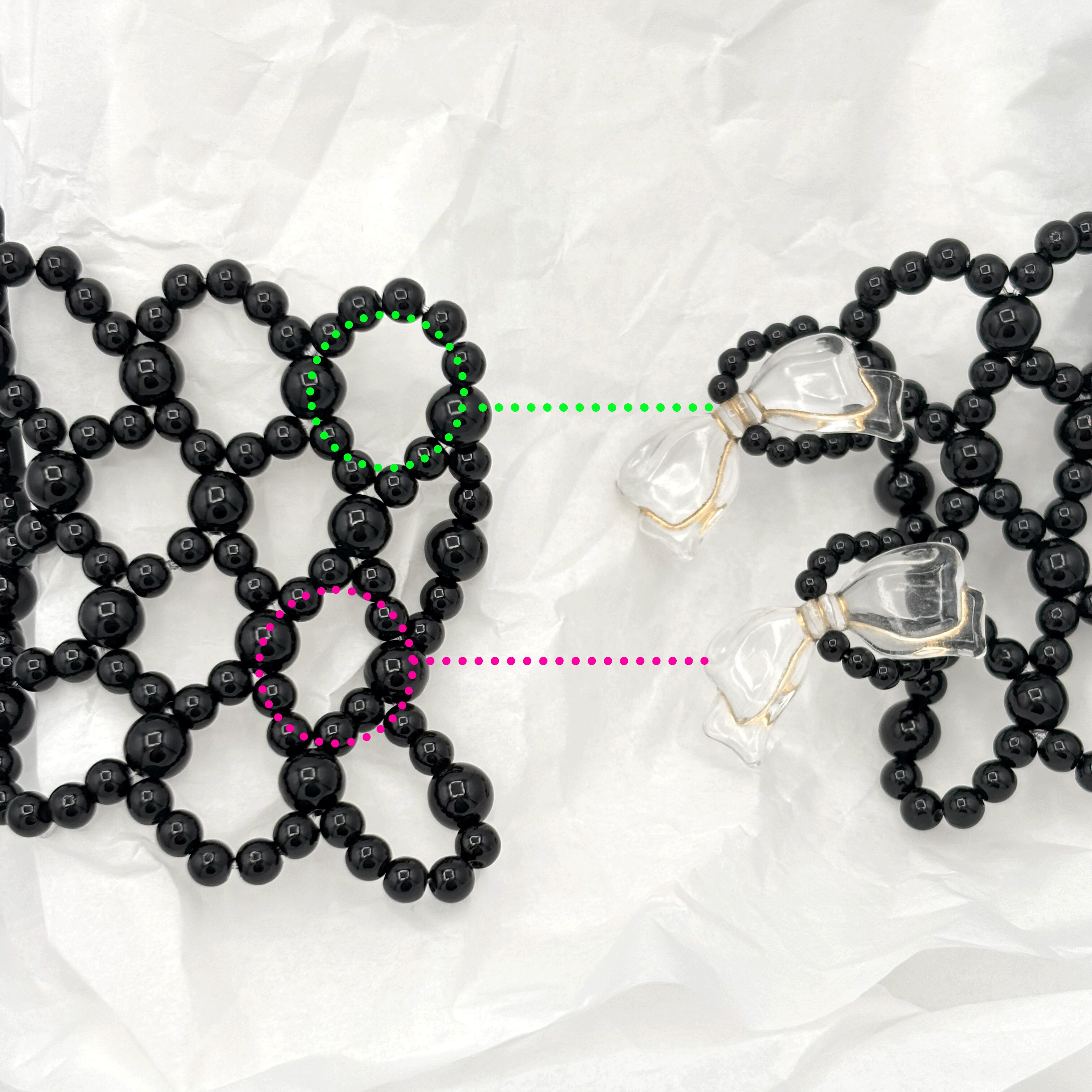 留め具としてリボン型のアクリルビーズを使用しています。