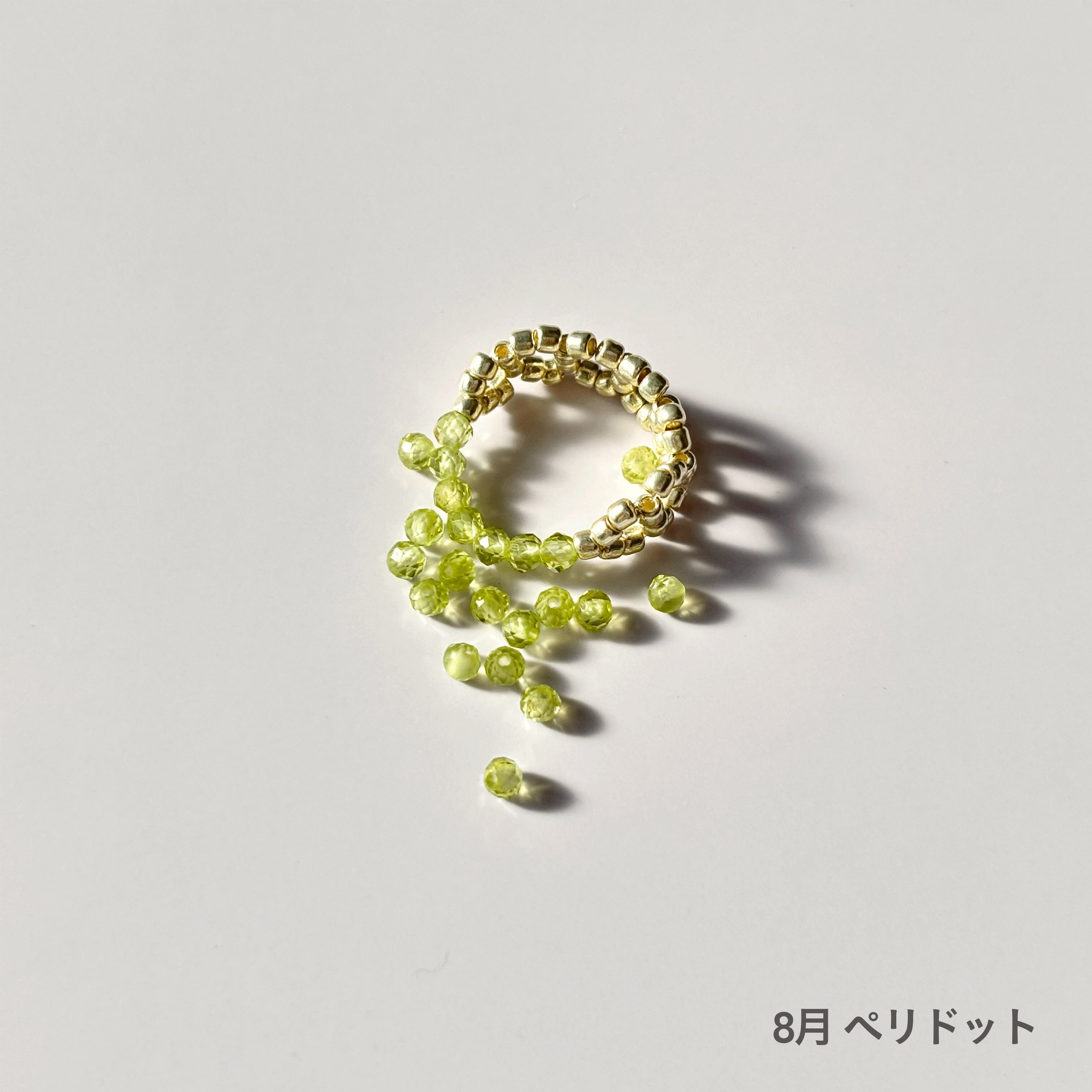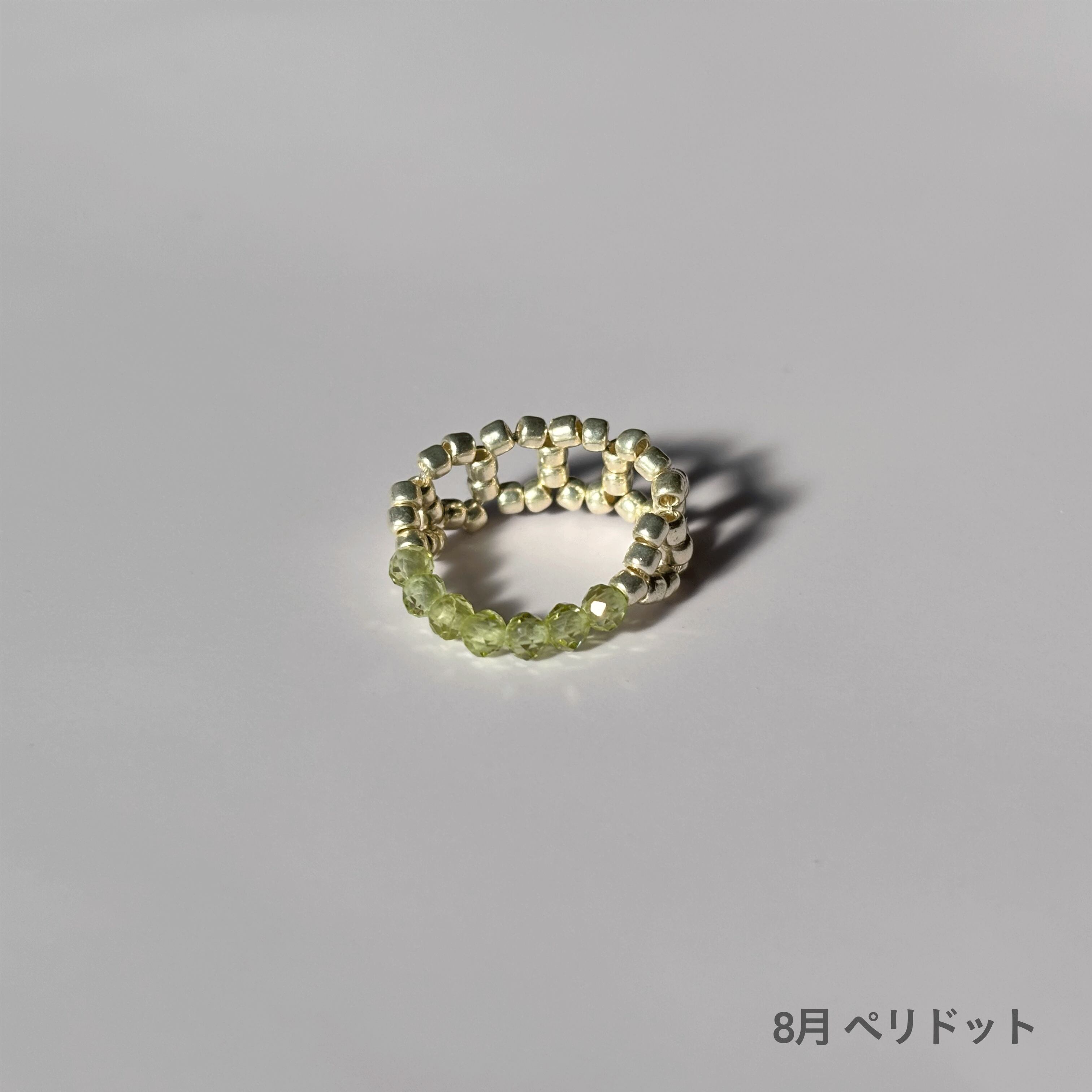 8月 ペリドット:石言葉は「運命の絆」「幸福」「平和」「希望」など。優しい色合いと穏やかな輝きで、マイナスな感情を癒し、ポジティブな気持ちに導いてくれる「太陽の石」といわれています。