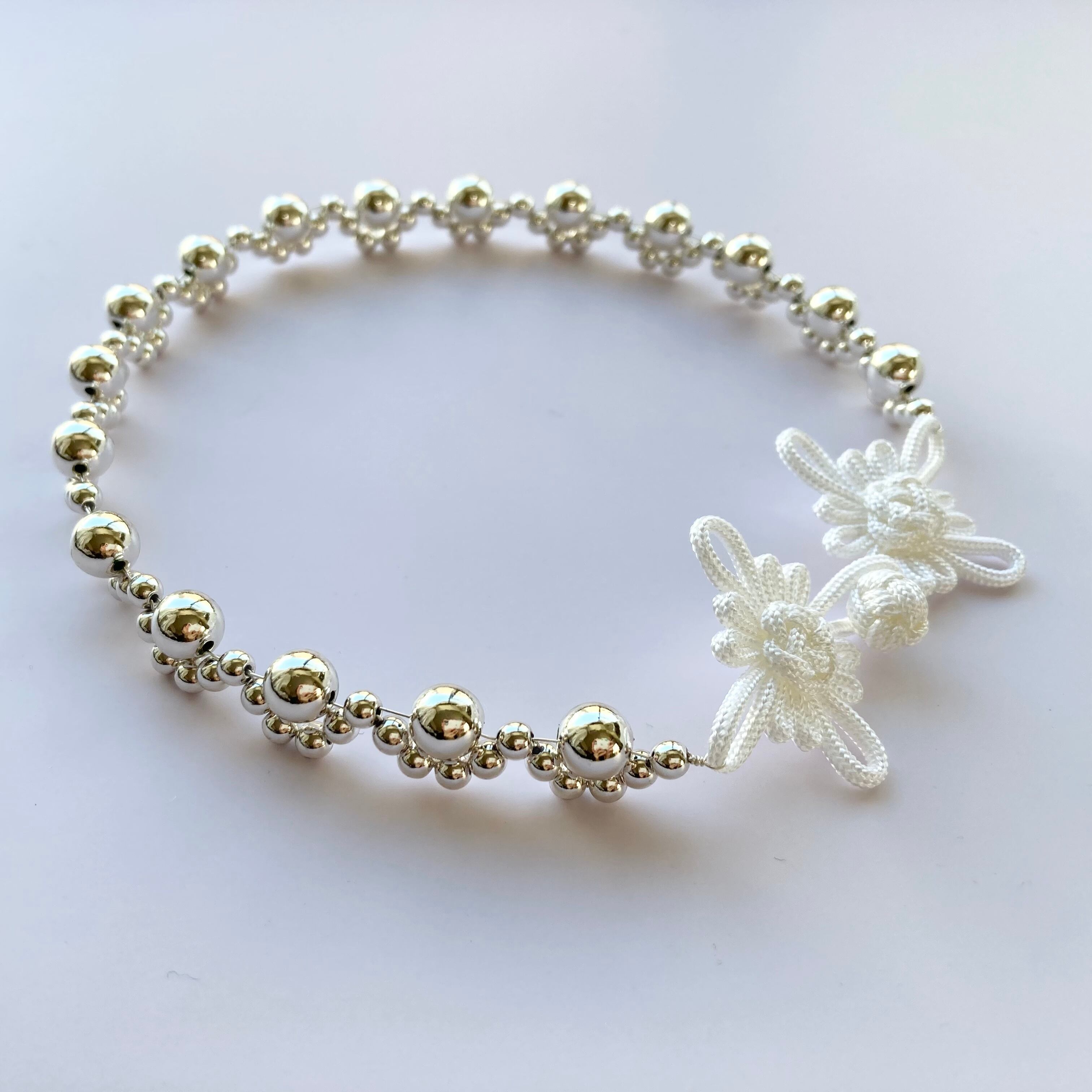 チャイナボタンを留め具に、ビーズをレース状にあしらったチョーカー。