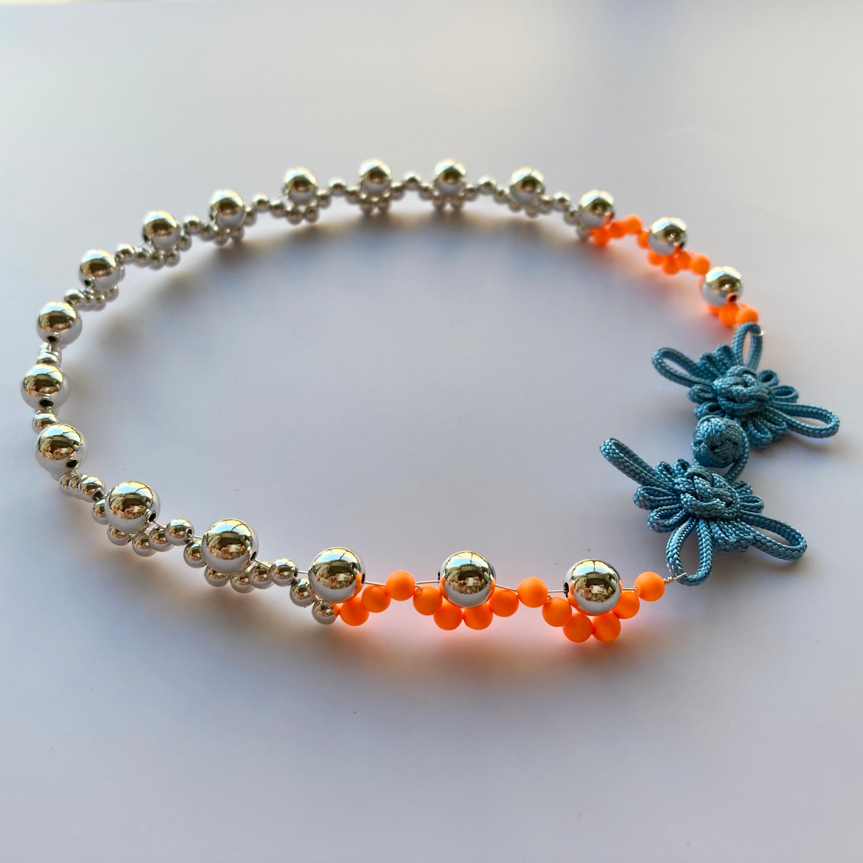 落ち着いたブルー×ネオンオレンジの鮮やかな配色をシルバーがまとめてくれています。