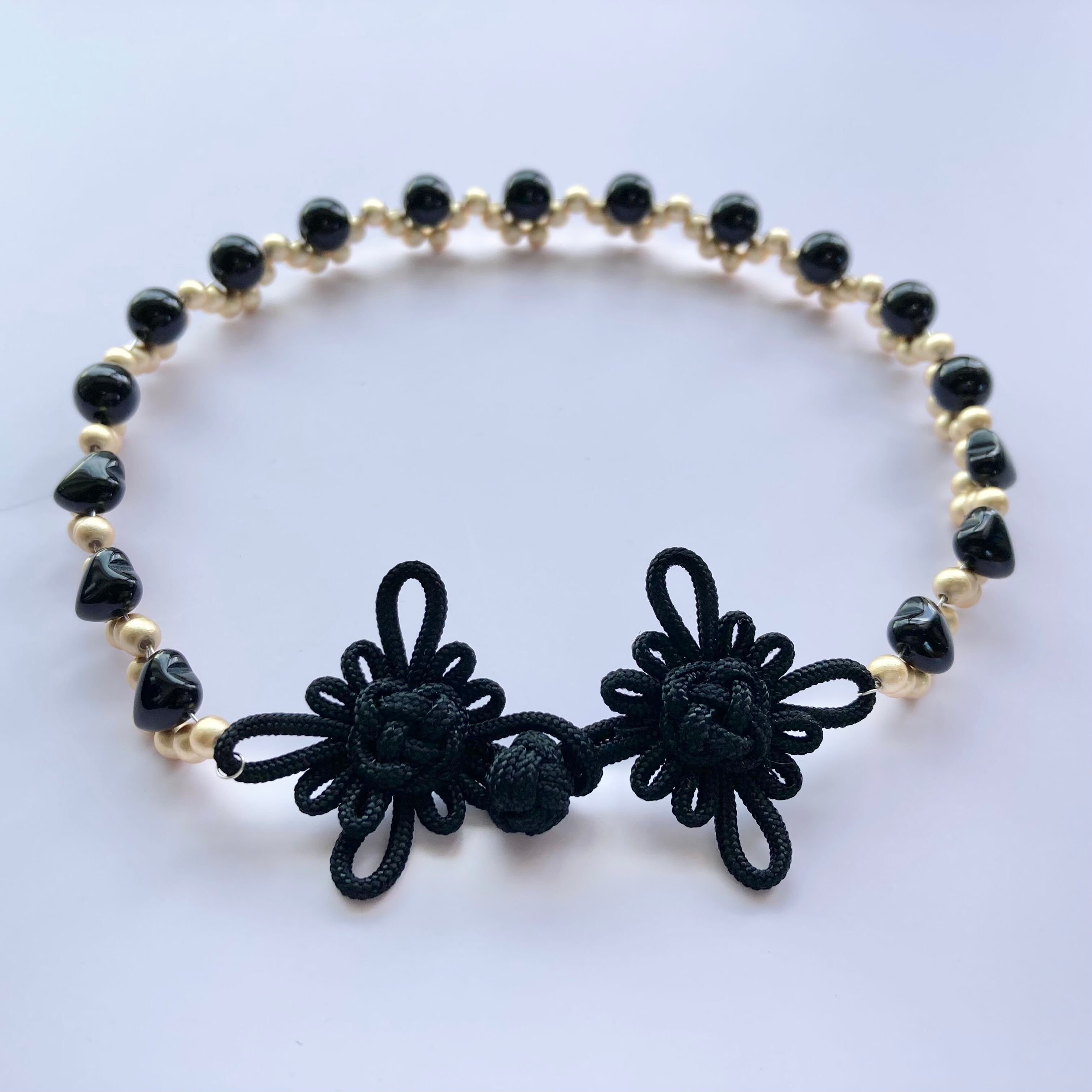 チャイナボタンを留め具に、ビーズをレース状にあしらったチョーカー。
