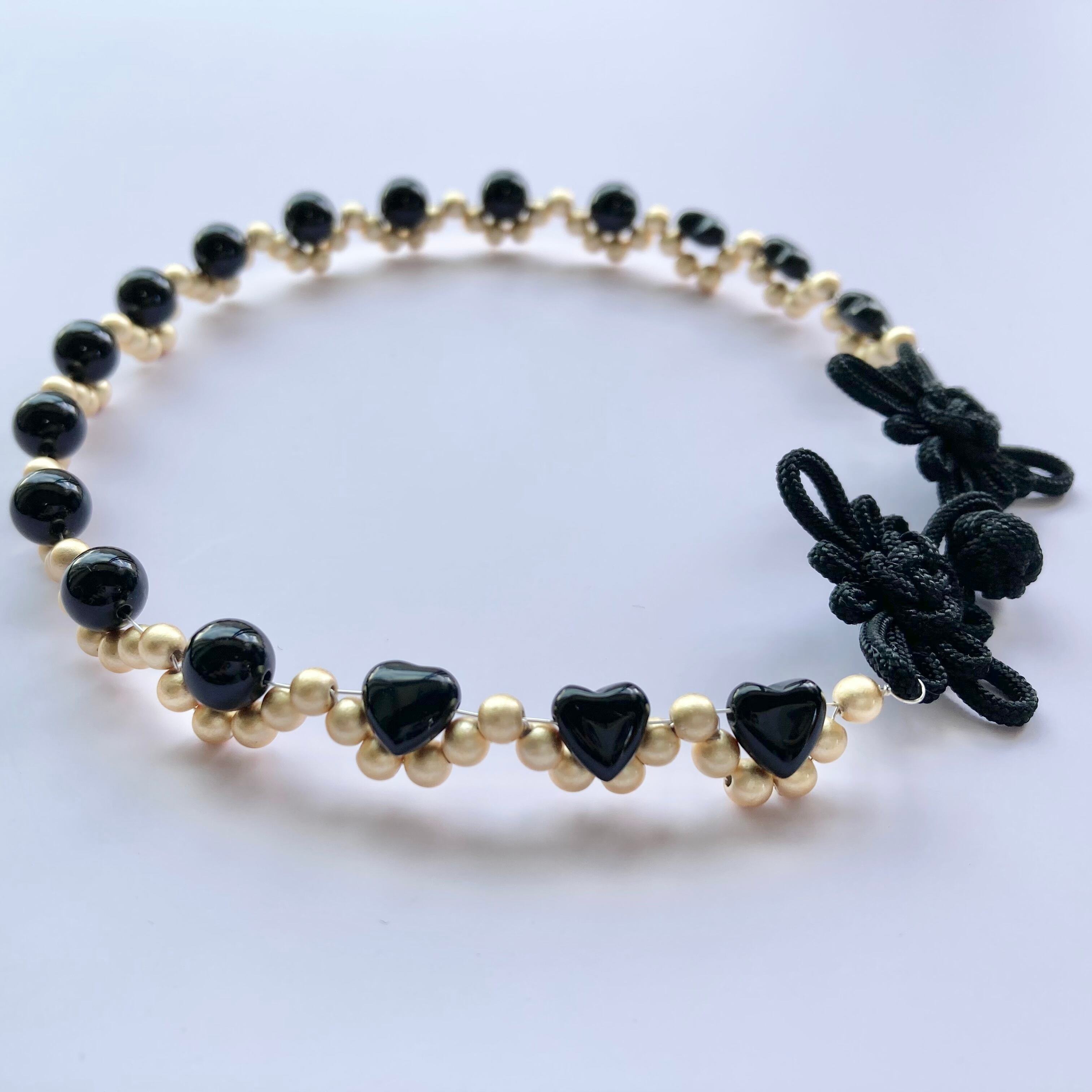 天然石オニキスのハート型を忍ばせ、色づかいはシックでありながらよく見るとラブリーな遊び心のある一品。