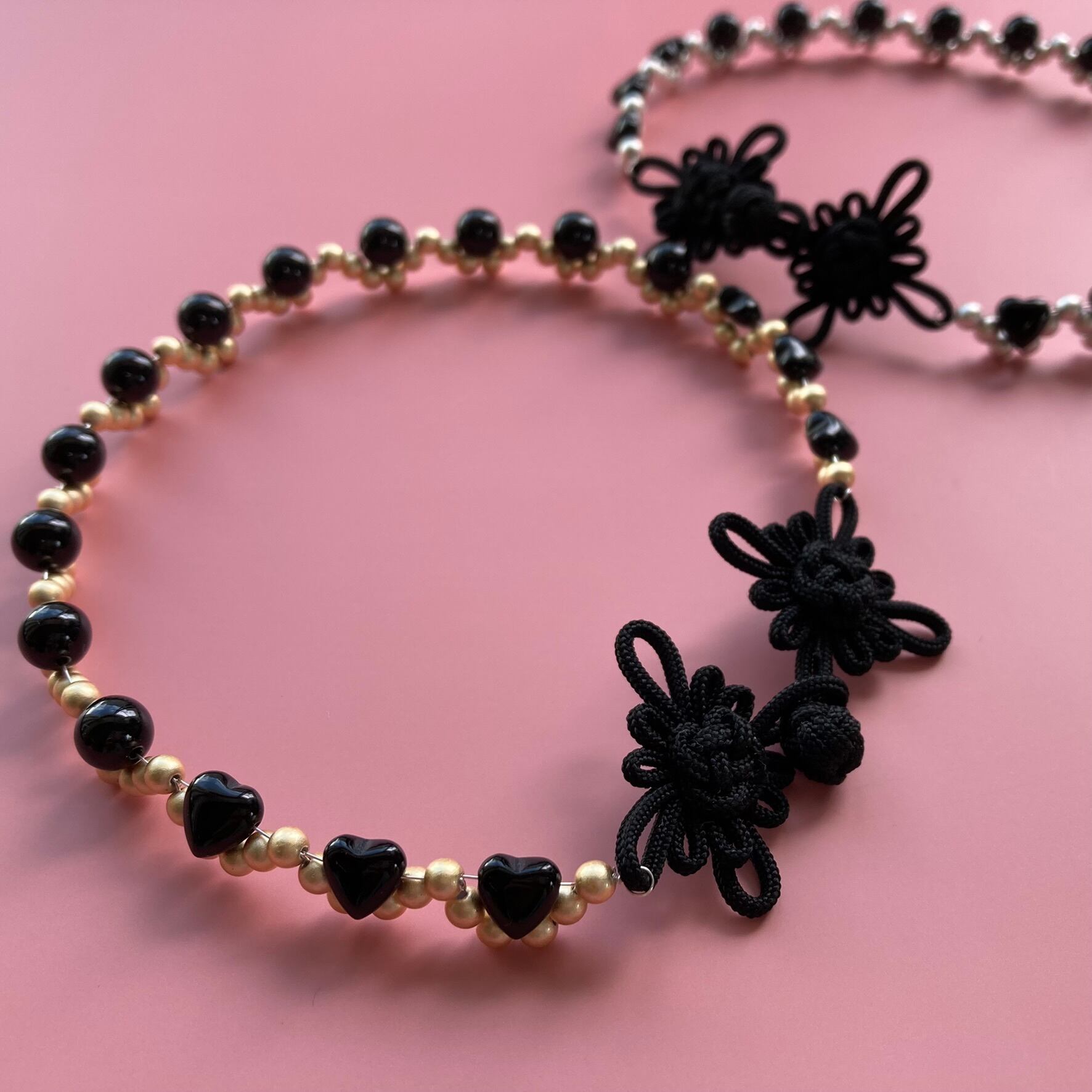 天然石オニキスのハート型を忍ばせ、色づかいはシックでありながらよく見るとラブリーな遊び心のある一品。
