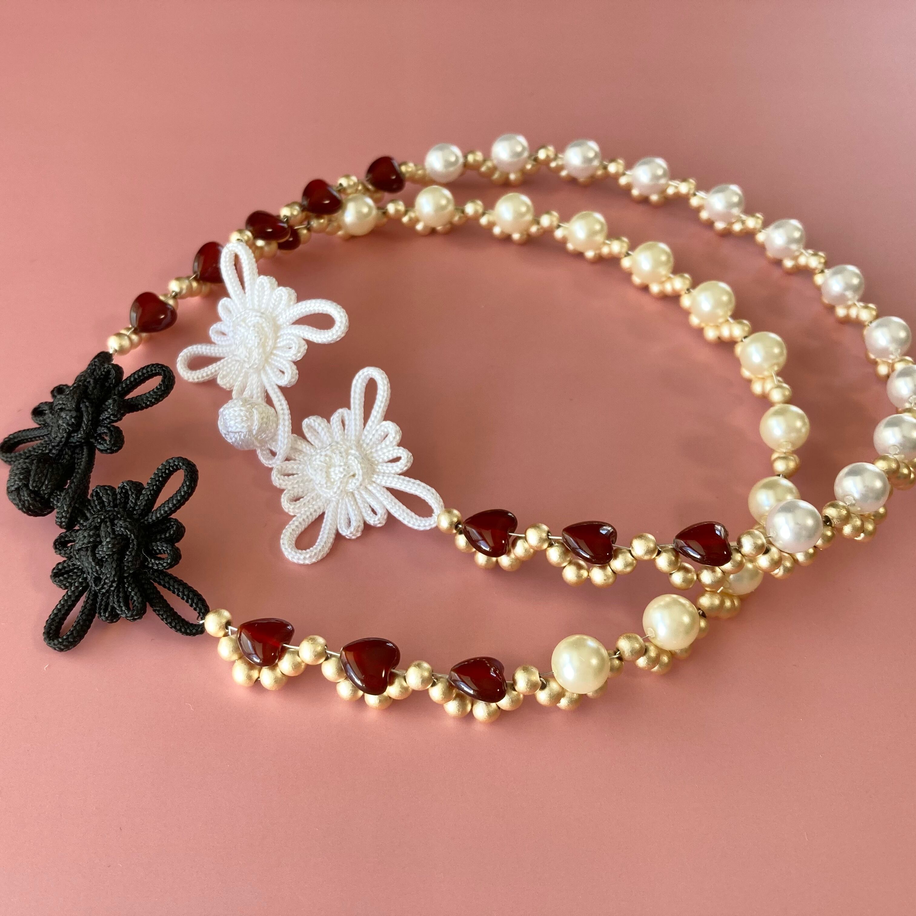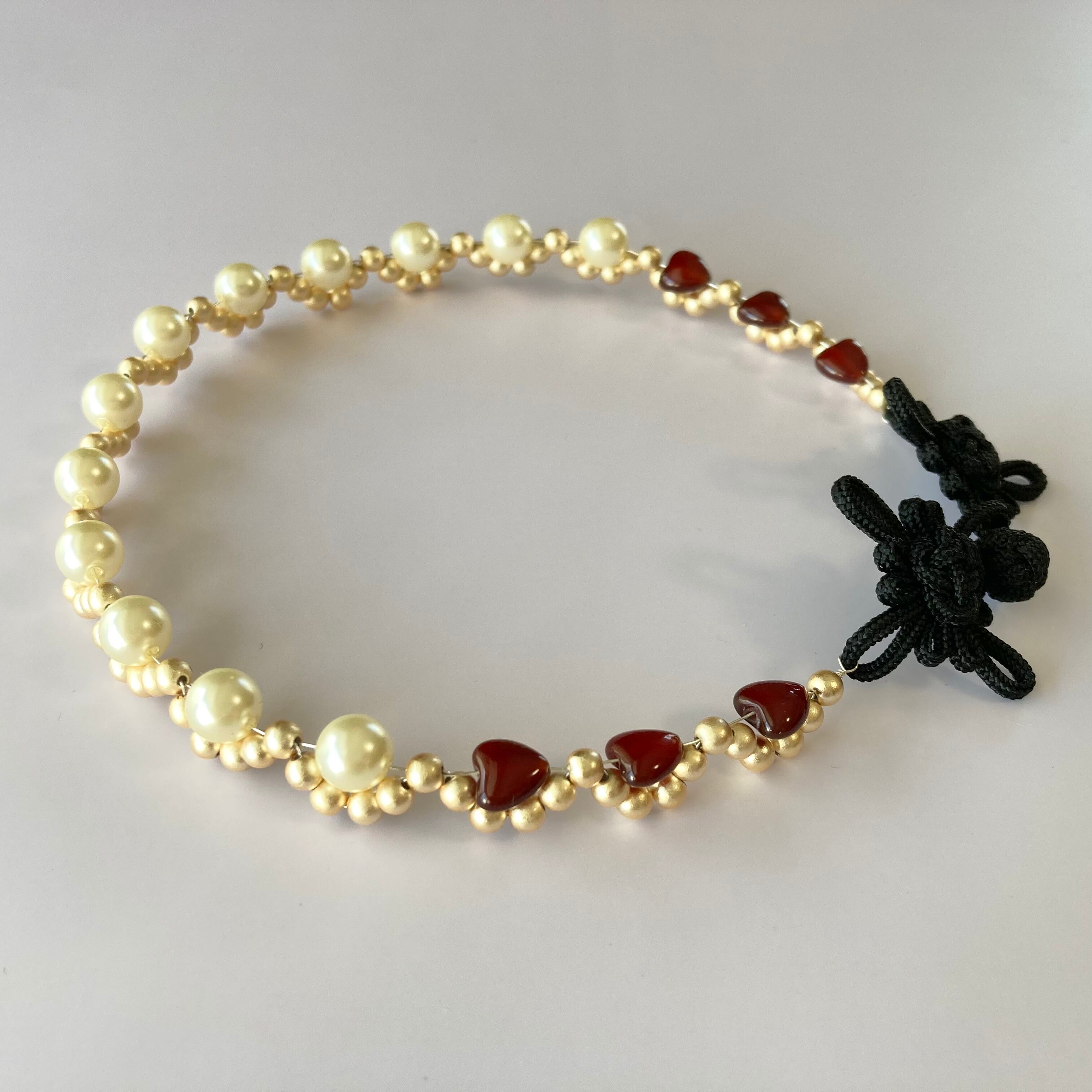 黒いチャイナボタン、黄色味のあるフェイクパール、つや消しの金色と合わせて、ザ・バレンタイン!のイメージで仕上げました。