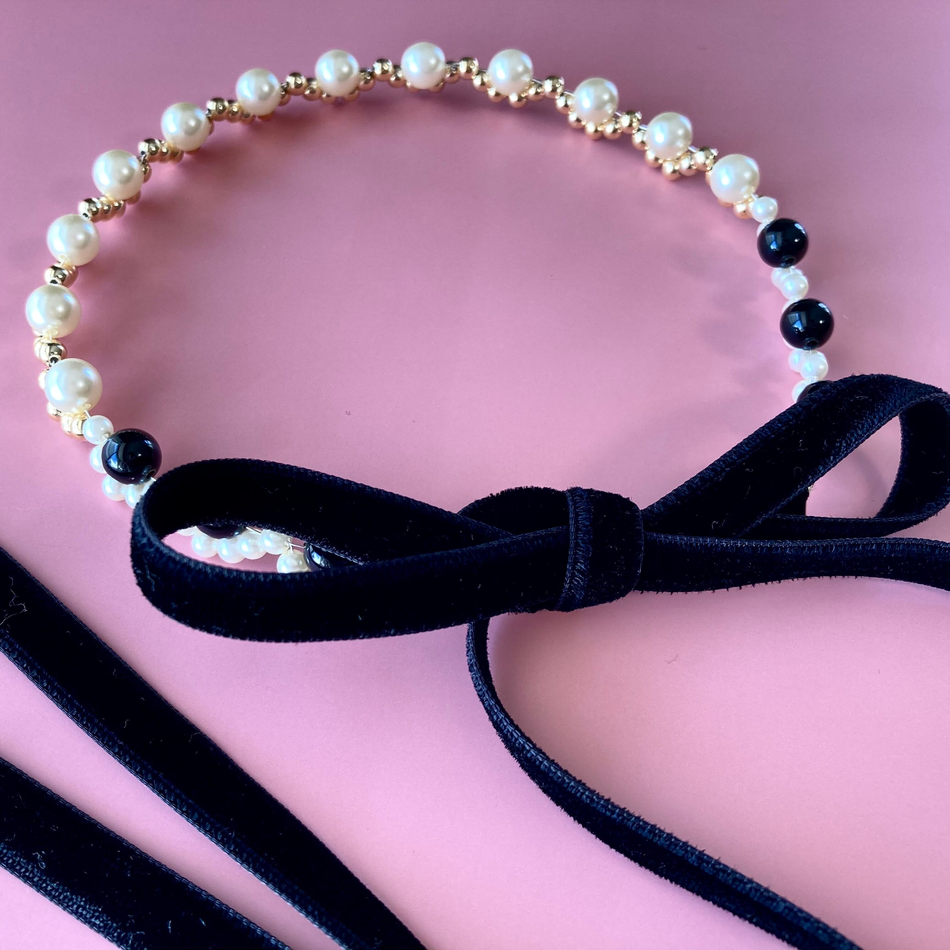 黒いリボンのすぐ横は黒のビーズを生成りのフェイクパールで縁取り、