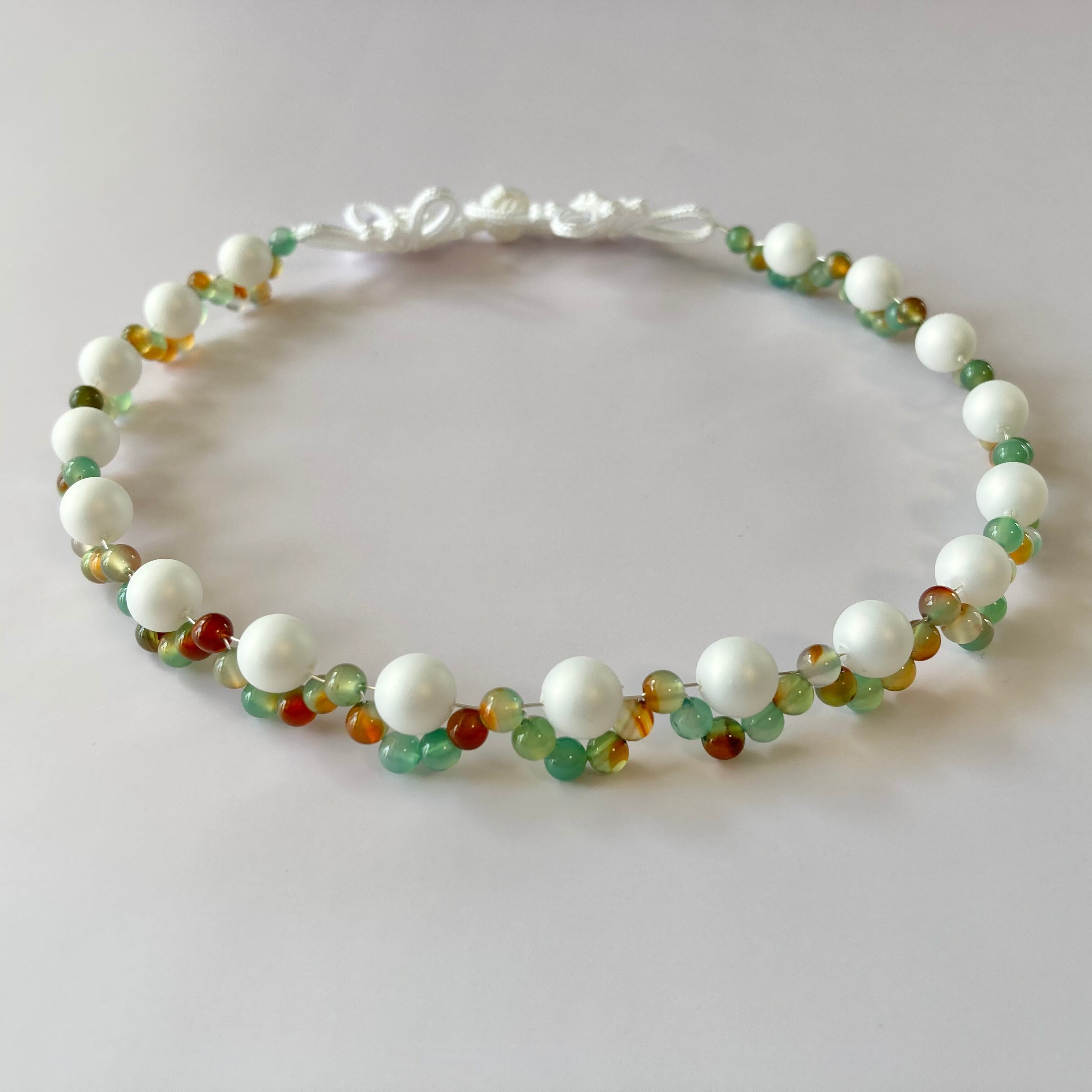 白いチャイナボタンに、白いつや消しのフェイクパール、縁取りは水色がかったグリーンと茶系のバイカラーがきれいな染色のカラーカルセドニーです。