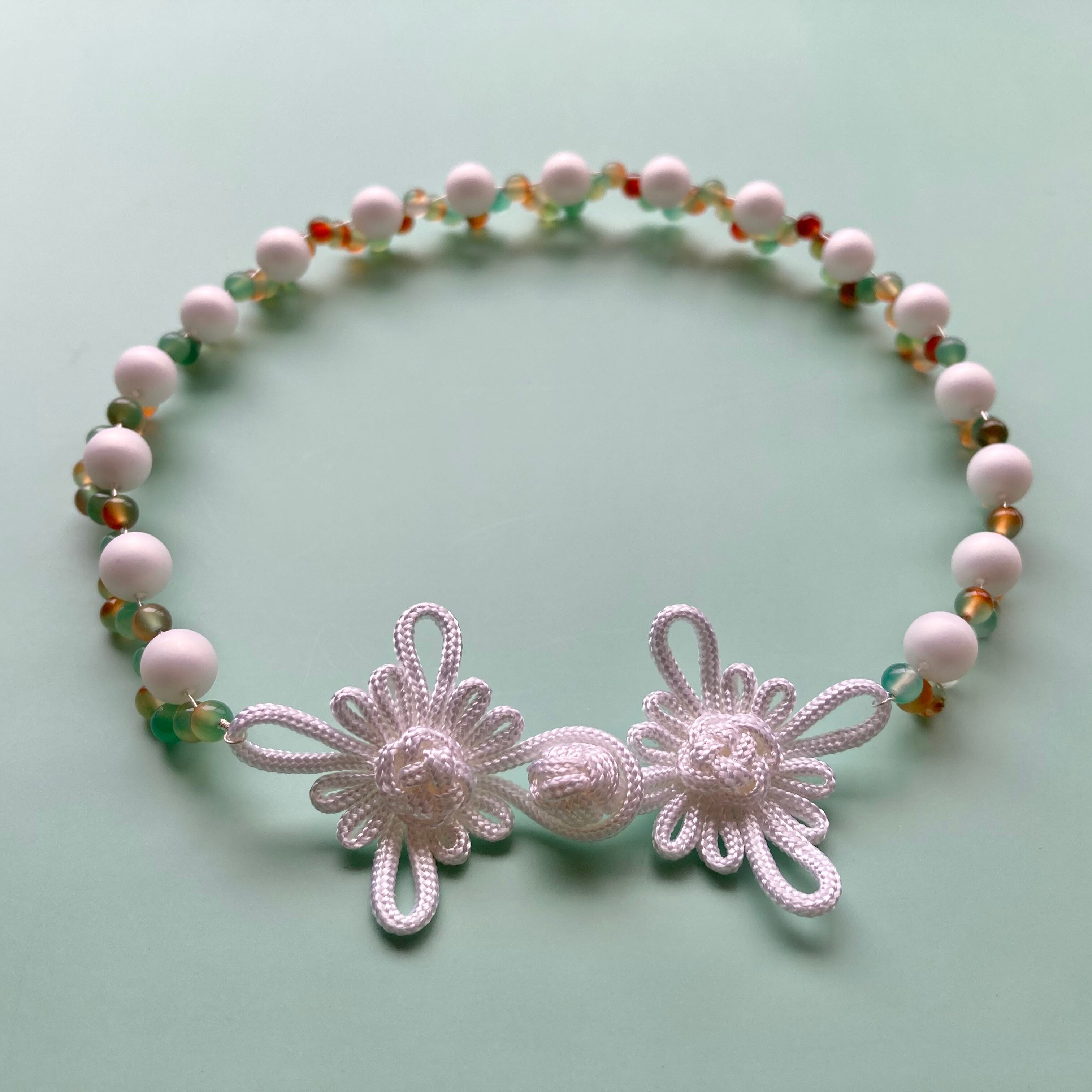 チャイナボタンを留め具に、ビーズをレース状にあしらったチョーカー。