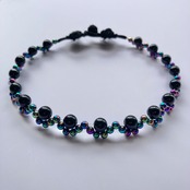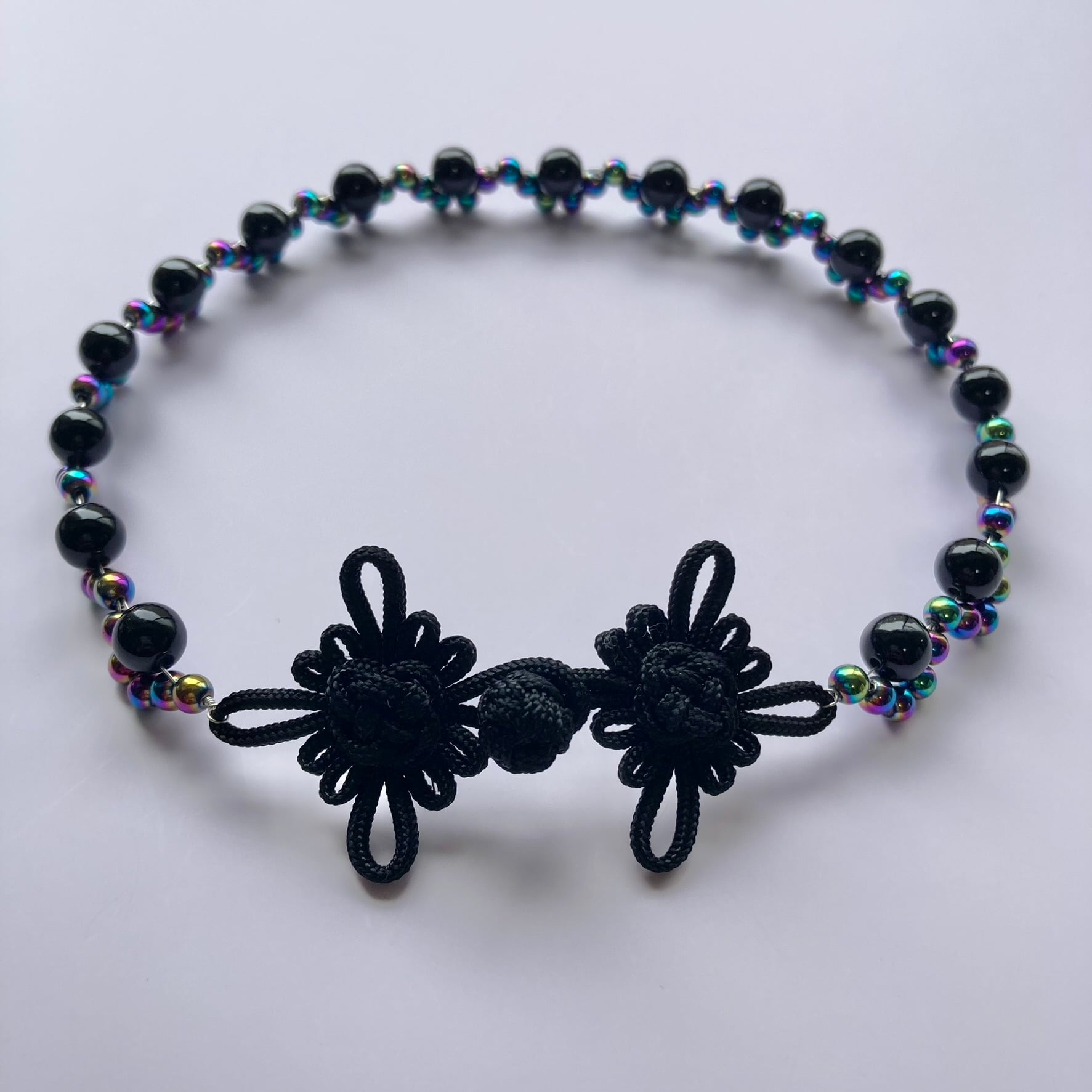 チャイナボタンを留め具に、ビーズをレース状にあしらったチョーカー。