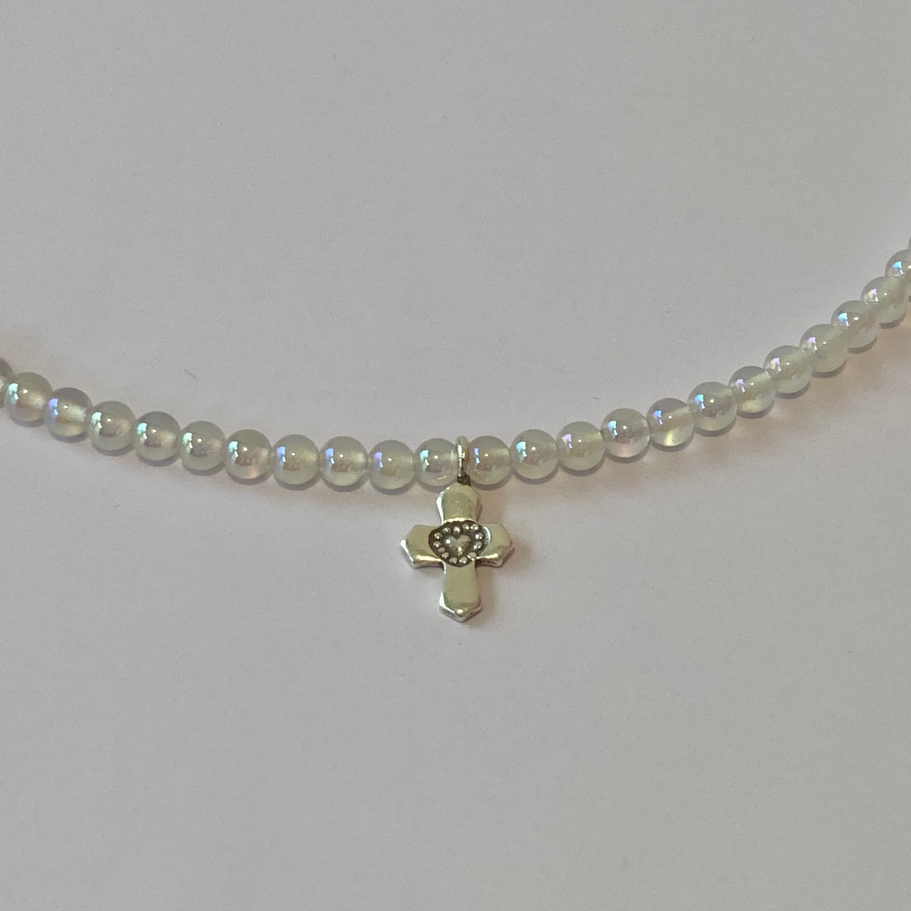 白い雲を巻き込んだシャボン玉のような、虹色のつやめきをまとったホワイトフラッシュカルセドニーと、カレンシルバーのクロスモチーフを合わせました。
