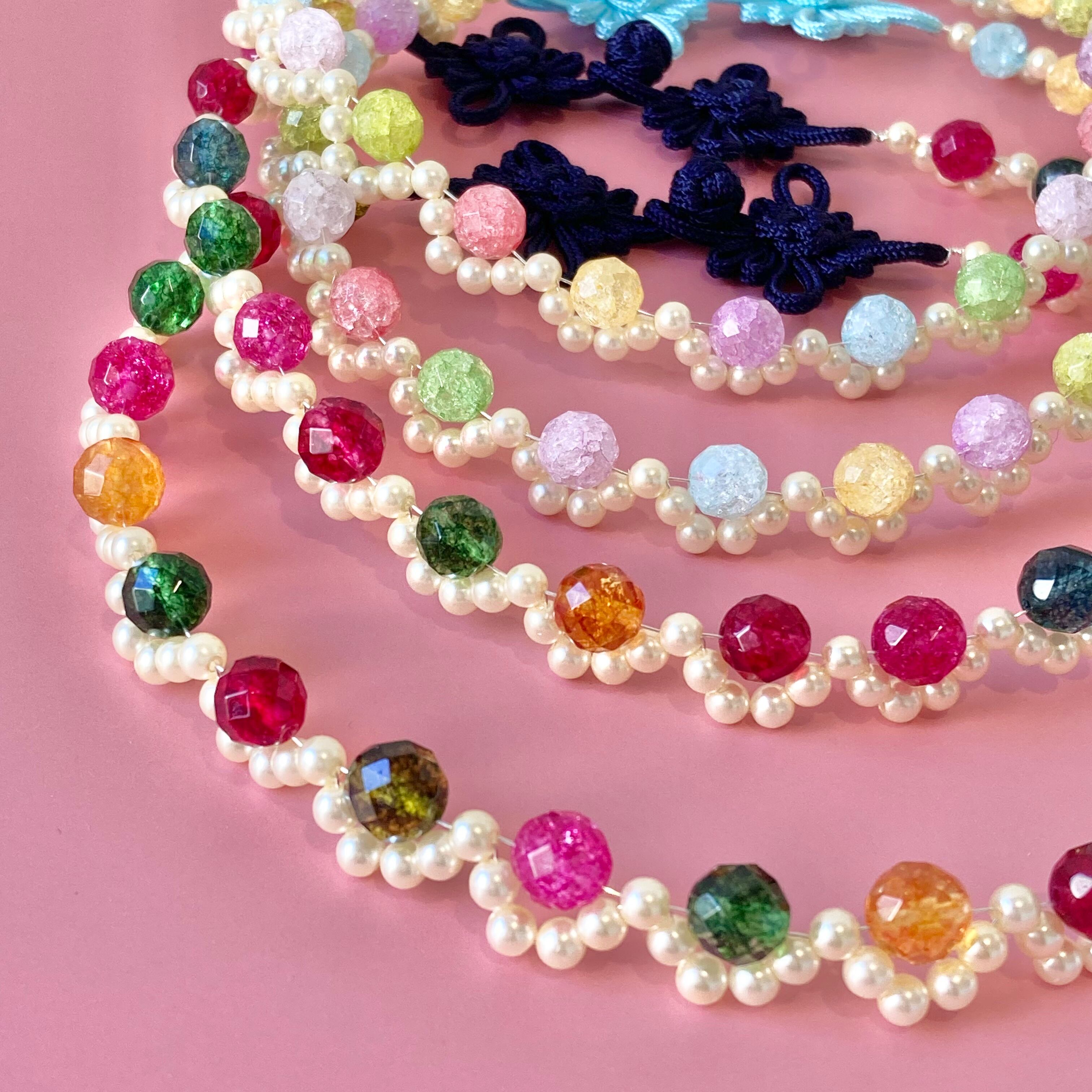 カラフルに彩られキラキラにカットされたドロップスのような天然クリスタルを、生成りのフェイクパールで縁取りました。