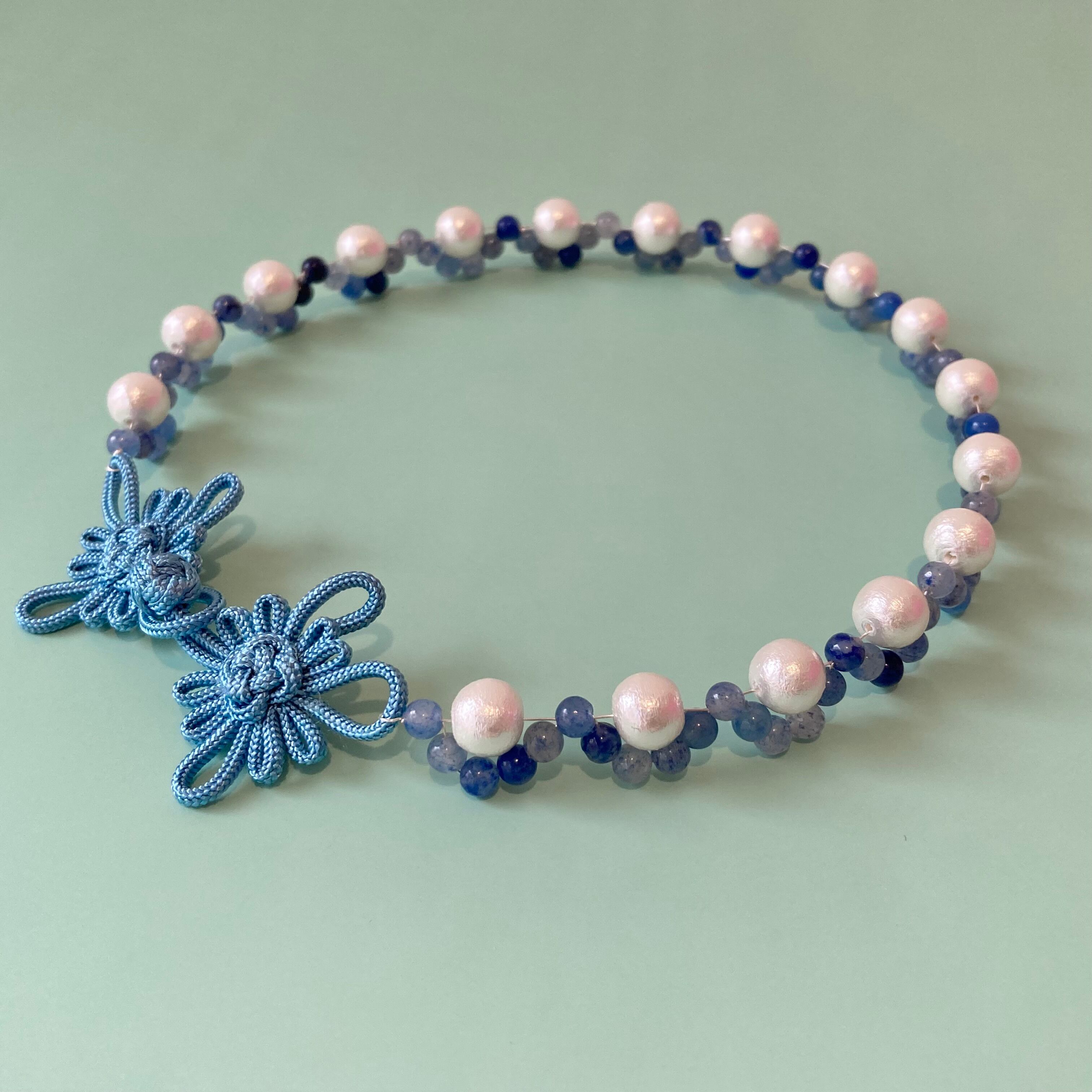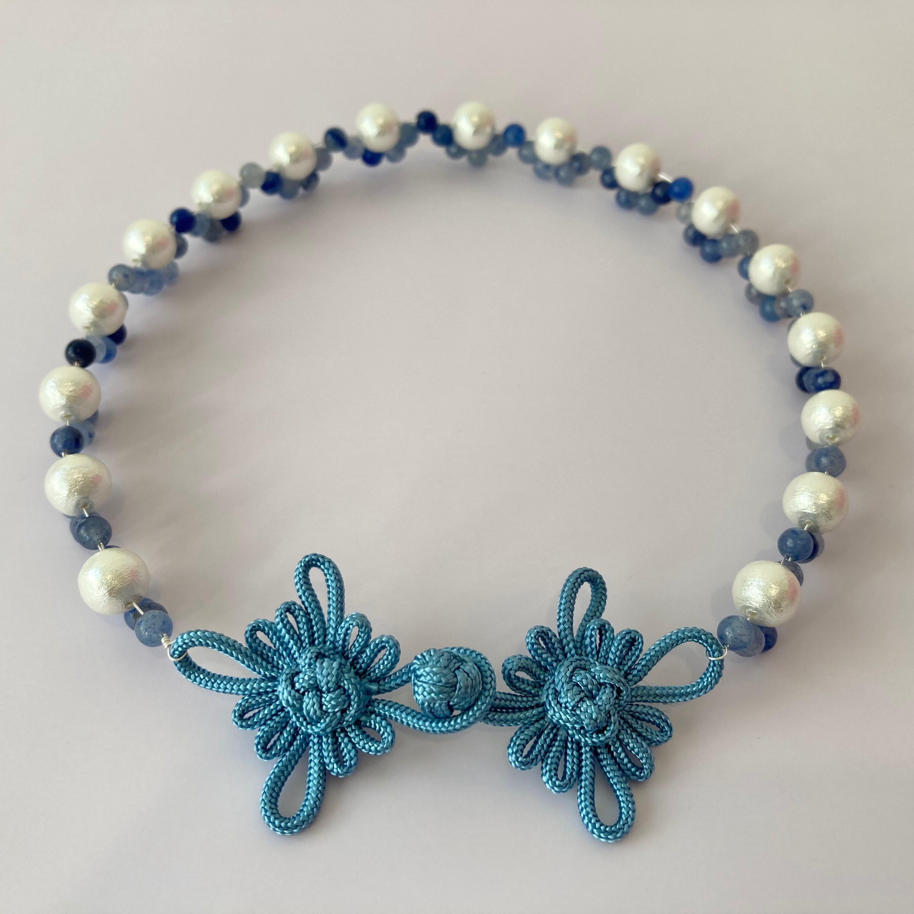 ホワイトのコットンパールを半透明のゆらぎのある天然石ブルークォーツで縁取り、サックスのチャイナボタンと合わせました。