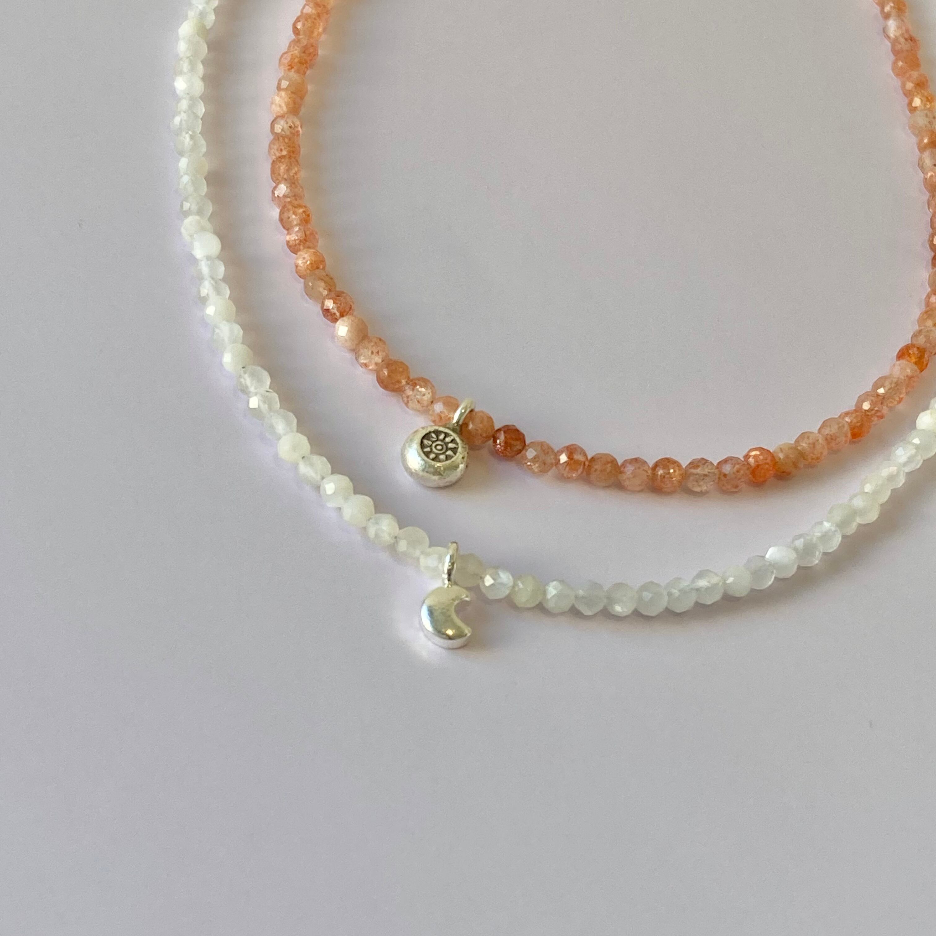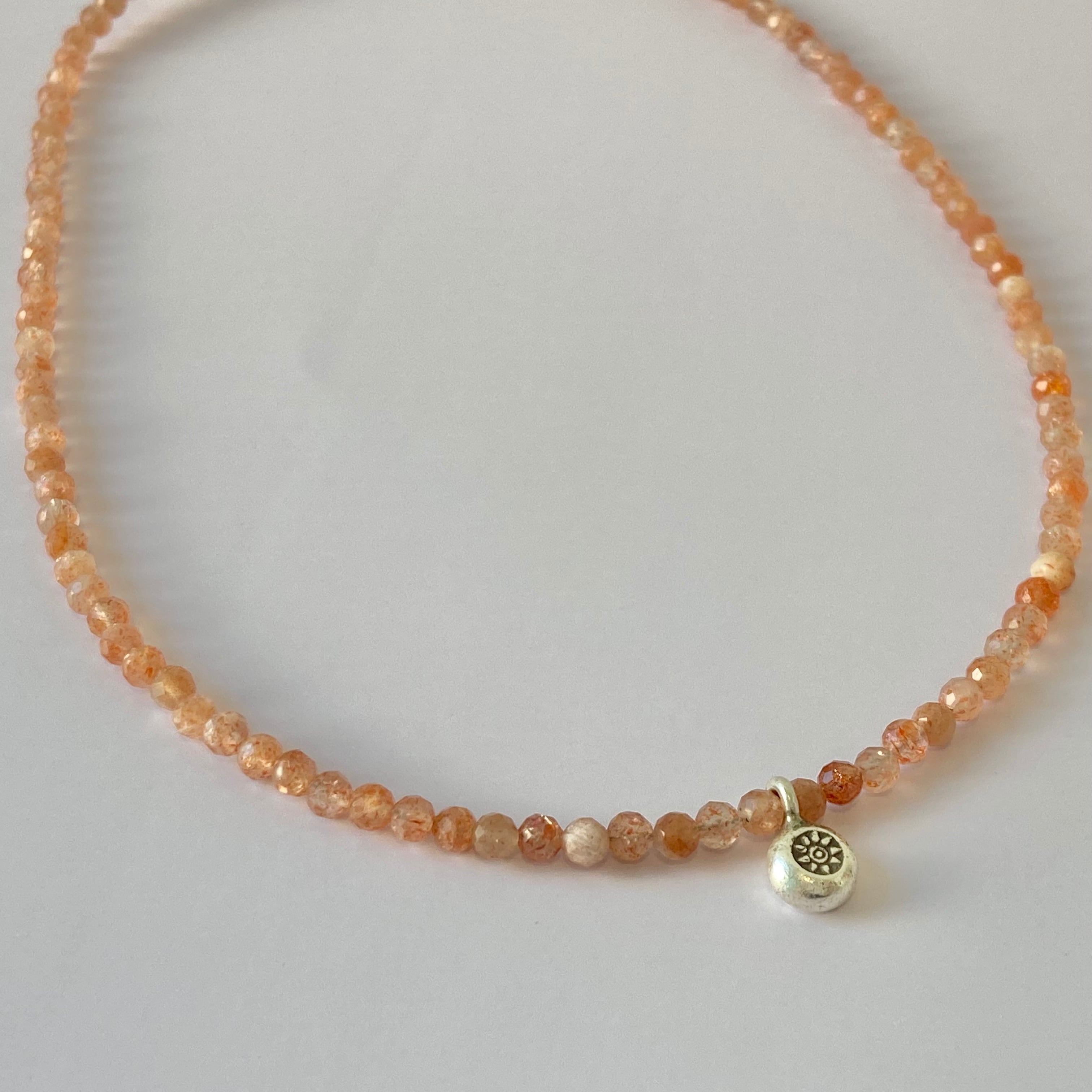 ラメのような内包物がきらめく、オレンジカラーのタンザニア産サンストーンと、太陽の刻印のカレンシルバーを合わせました。