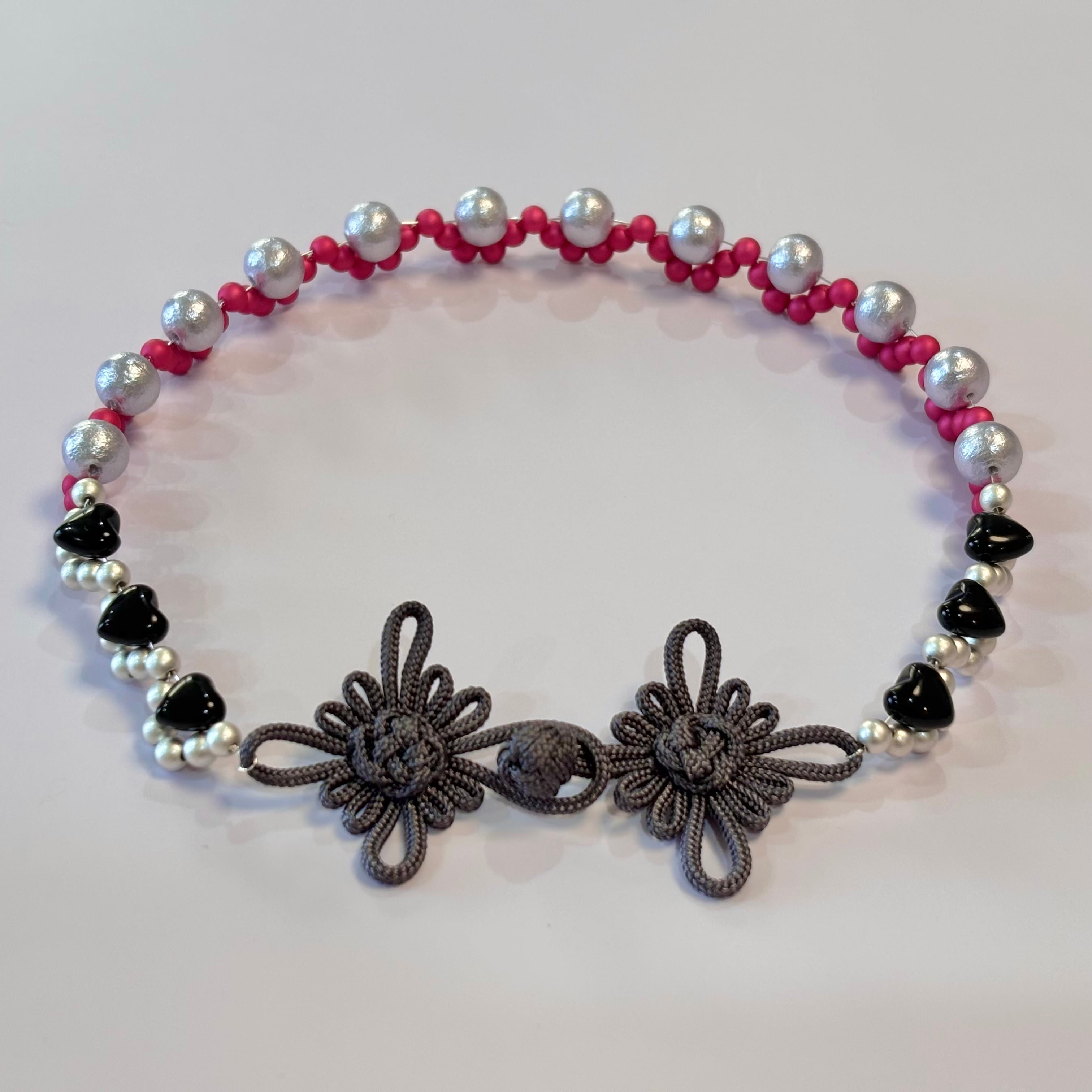 チャイナボタンを留め具に、ビーズをレース状にあしらったチョーカー。