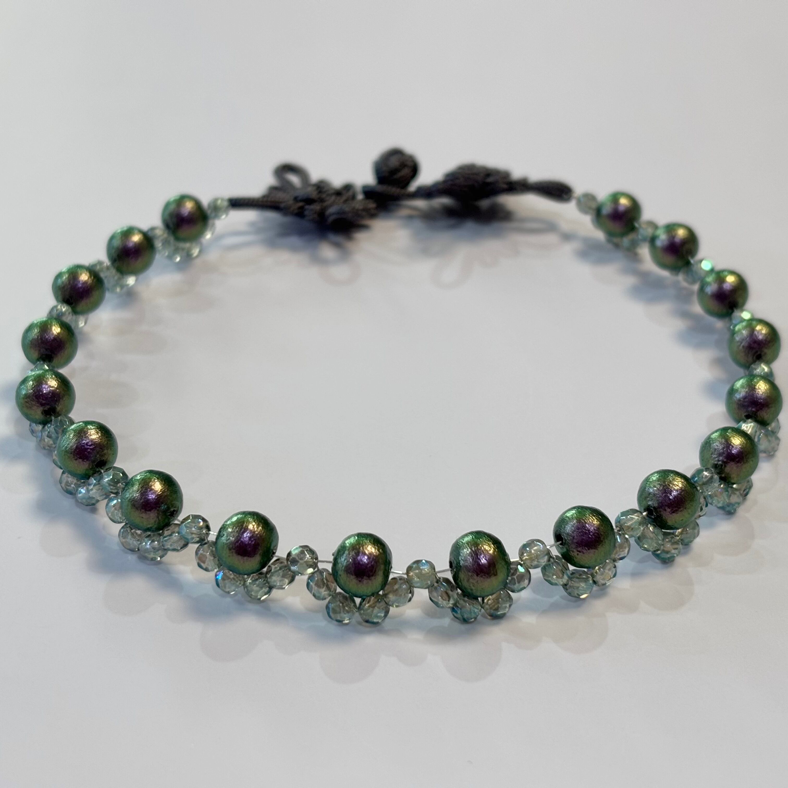 チャコールグレーのチャイナボタンに、グリーン〜パープルの偏光が見られるダークカラーのコットンパールを合わせました。